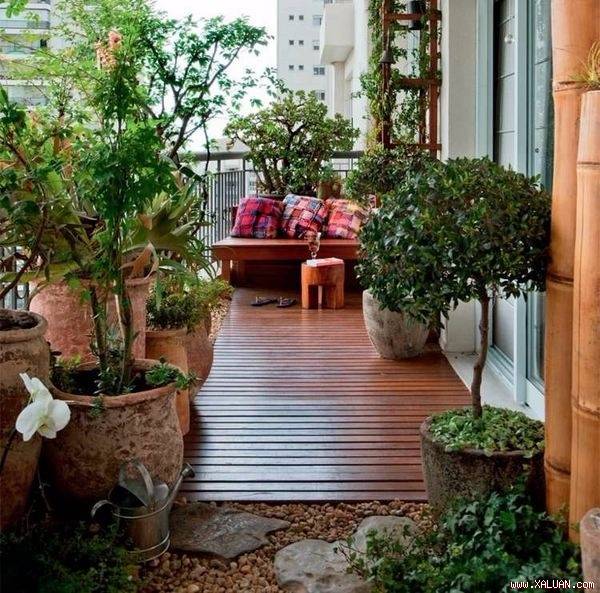 Khi ban công nhà bạn có diện tích rộng thoáng, bạn có thể chọn lựa gạch gỗ để ốp cho một phần lối đi. Xung quanh nơi ít sử dụng cho việc đi lại, bạn có thể rải sỏi để trồng cây, vừa tăng thêm sự liên kết giữa các vật liệu thiên nhiên vừa tạo nét đẹp mới mẻ cho ban công.