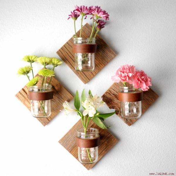 Những chai nước hoa quả bằng thủy tinh, hay bất cứ chai thủy tinh nào cùng loại đều có thể ghim vào tường và cắm hoa tươi. Bạn có thể bài trí dọc hành lang, cầu thang hay ở góc nào đó trong phòng khách.